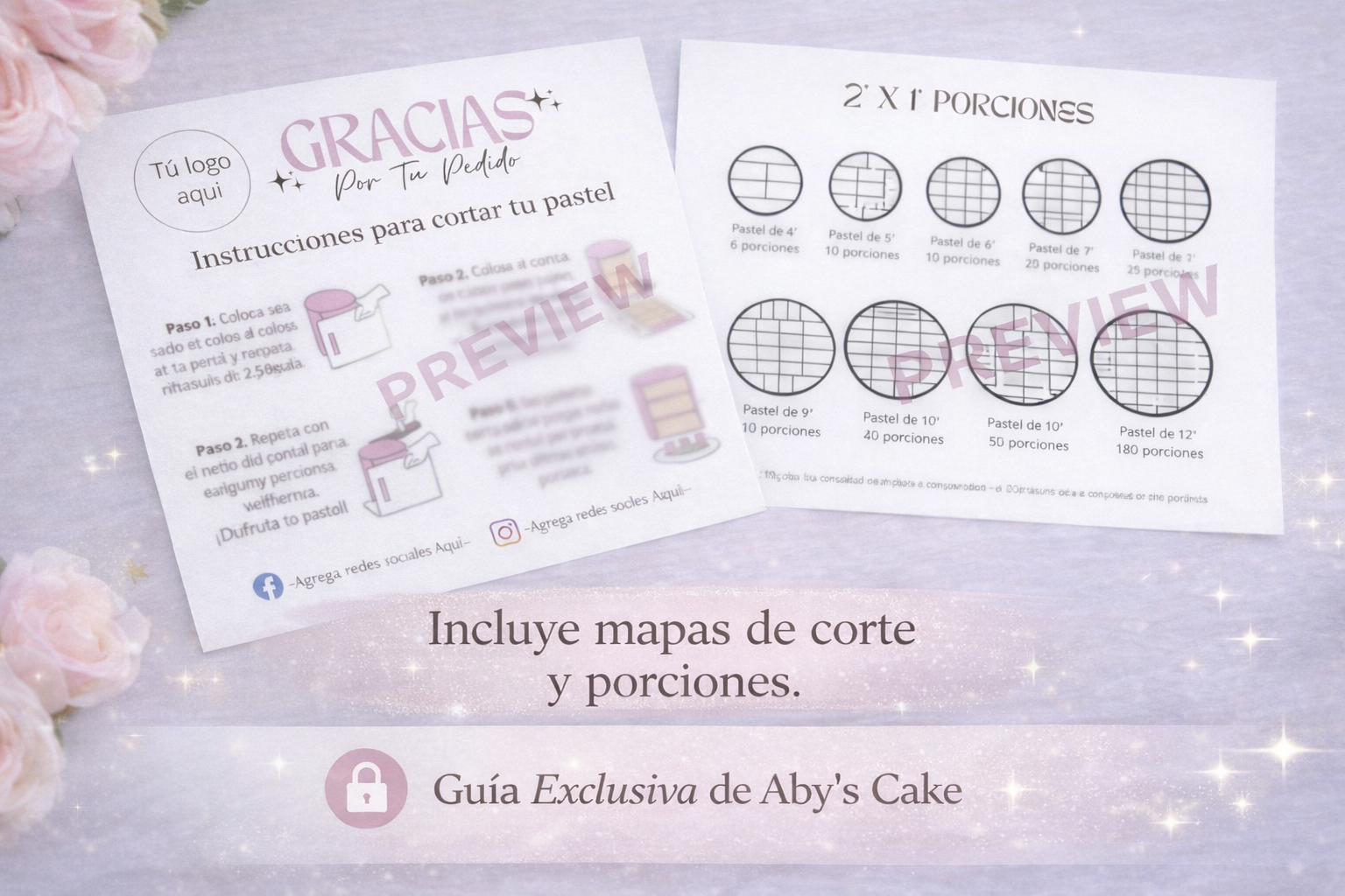 Esta guia está diseñada para ayudar a tus clientes a cortar el pastel correctamente y obtener las porciones adecuadas, evitando confusiones y asegurando una mejor experiencia en su evento.